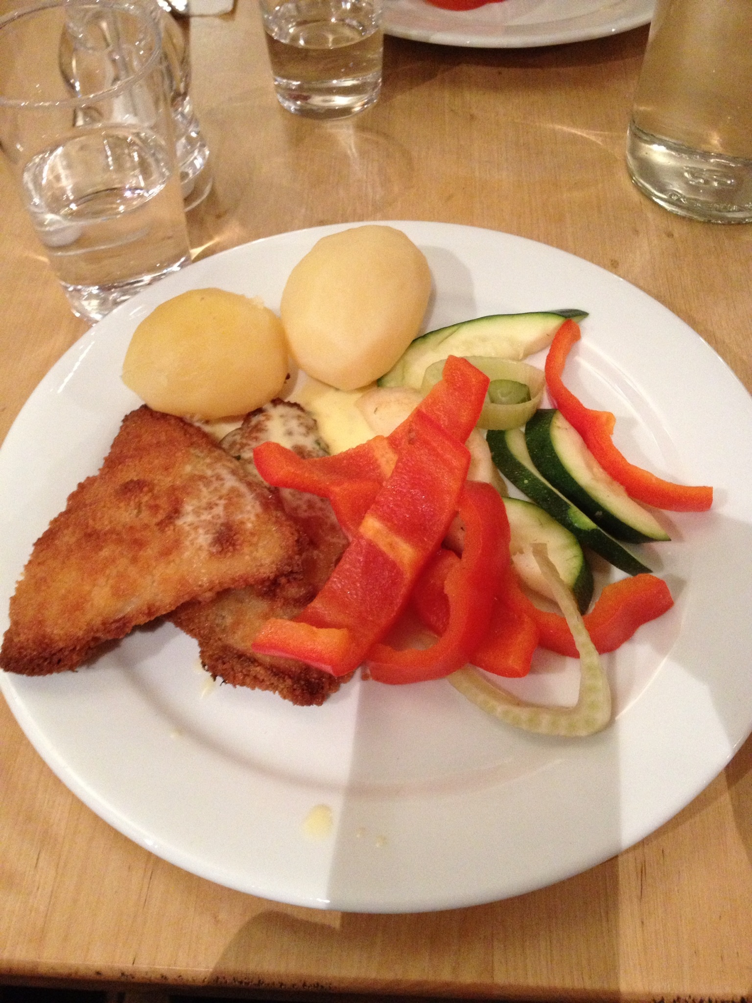 Our first meal in Norway at the Best Western Bondeheim in Oslo was adequate, but the fish and potatoes and vegetables seemed very delicious because I was ravenous. The dessert was lame, a small partially-thawed brownie. It reminded me of the description of the wine available for purchase on the Icelandic Airlines flight, “served in a beautiful plastic cup.”