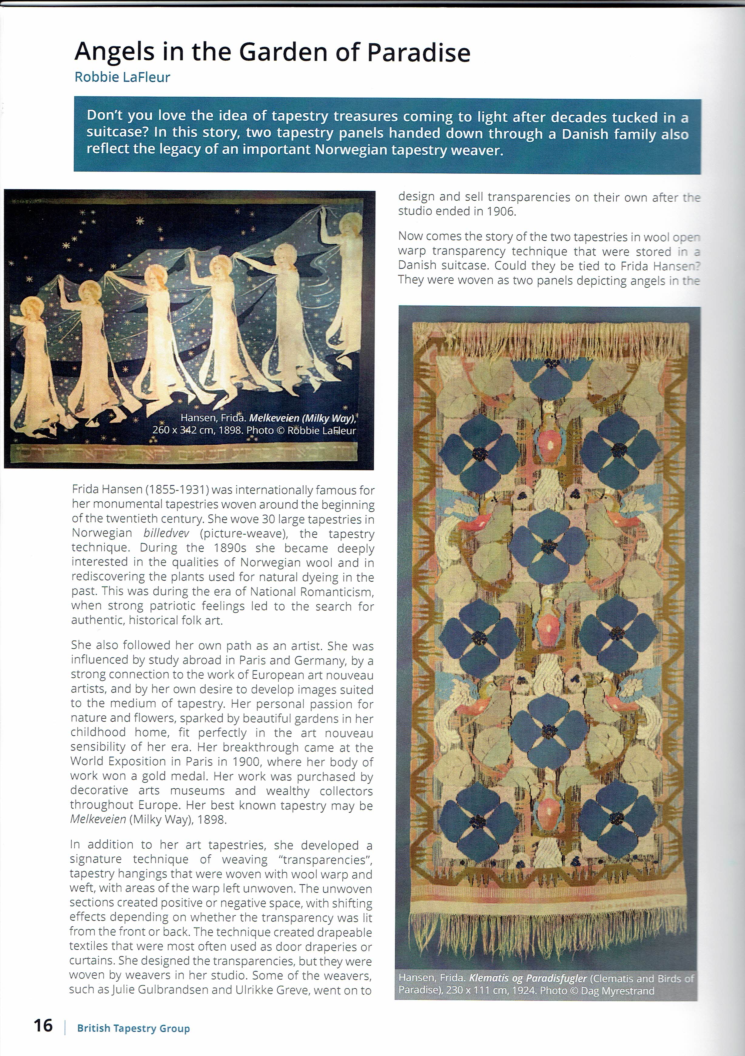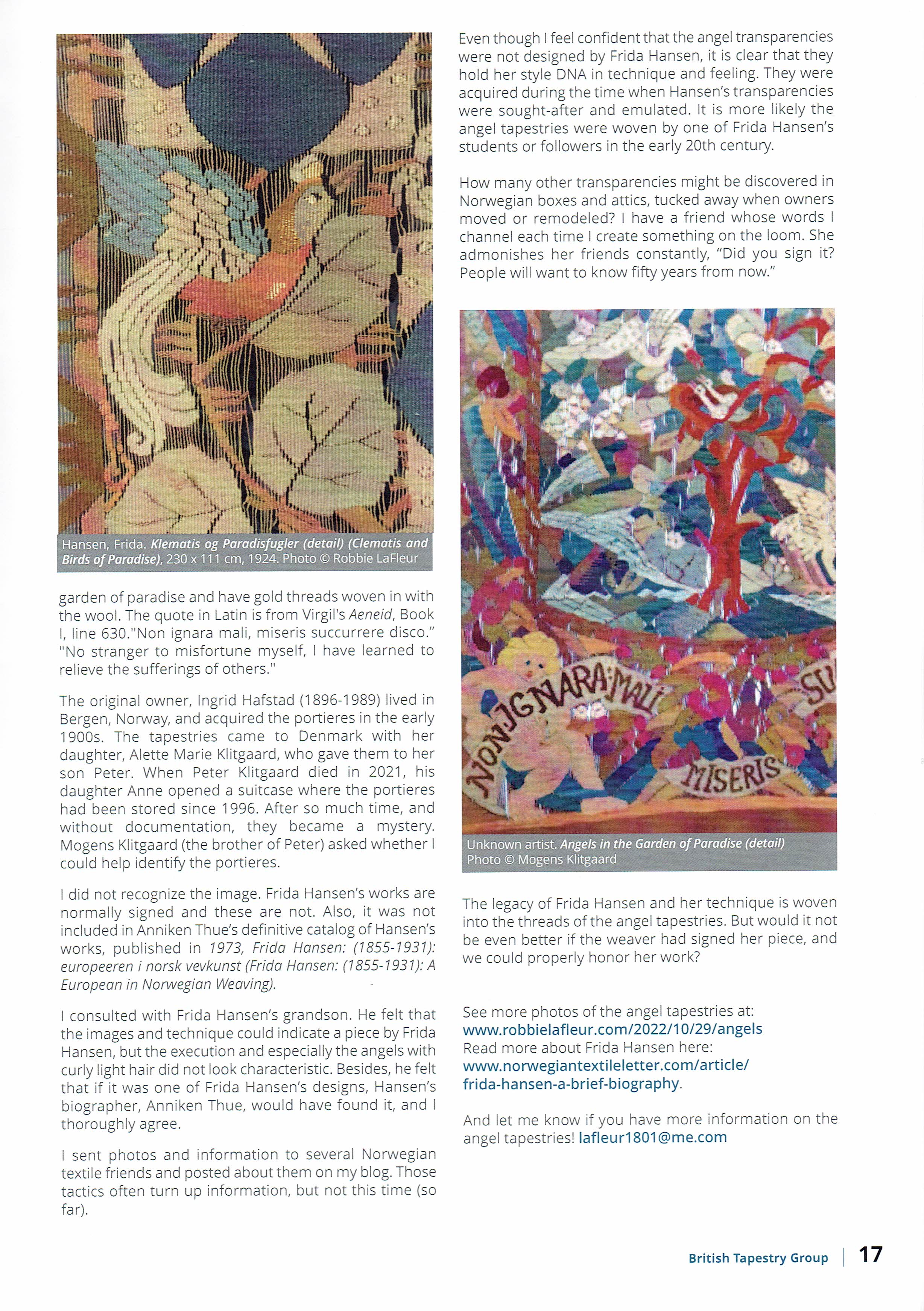 I first wrote about a pair of transparent tapestries owned in Denmark on this blog more than a year ago (“Do You Recognize these Transparent Tapestry Designs?” October 22, 2022). Alas, the mystery remains, even though the clues appeared again this fall in the magazine of the British Tapestry Group. Tapestry Weaver (Issue 34, September 2023).
