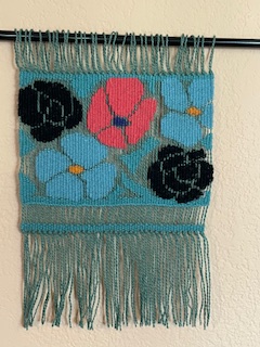 Wendy Gilmore, who attended the Conference of Northern California Handweavers workshop, recently completed a lovely bird and flower composition, after healing from a shoulder fracture. Perhaps this tapestry technique was the best type of weaving during recovery; it doesn’t require banging threads on a loom like some other techniques.